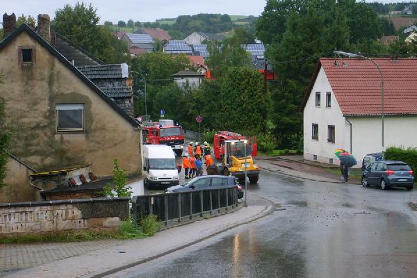 Eppelborn. Es waren wieder die bekannten Einsatzstellen, zu denen die Feuerwehr kurz nach Beginn der schweren Regenfälle am 06. August 2011 gegen 14:44 Uhr alarmiert wurden: Während der Löschbezirk Bubach-Calmesweiler in der Calmesweiler Straße Schutt und Geröll von der Fahrbahn räumen musste, wurde die Männer und Frauen aus dem Löschbezirk Eppelborn zur Straße "Am Kloster" gerufen. Auch dort war wie schon mehrfach in den vergangenen Wochen die Fahrbahn überflutet und die Straße dadurch unpassierbar geworden.