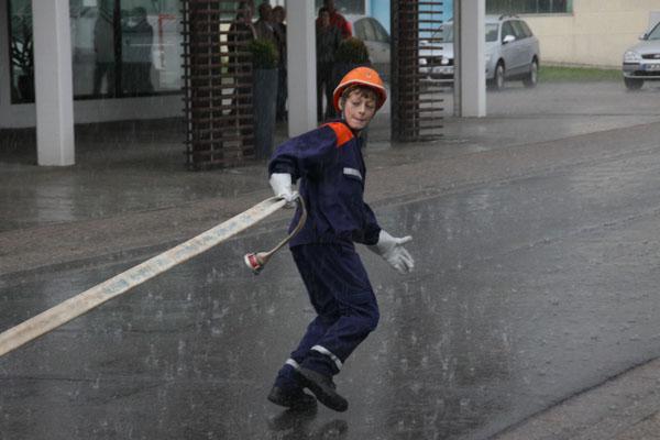 Doch die Jugendlichen ließen sich nicht von dem Starkregen und dem aufkommenden Hagel beeinflussen und versuchten, dem Unwetter standzuhalten. Tapfer wurden die Strahlrohre in Richtung des angenommenen Feuers gehalten. Nach kurzer Zeit mussten die Verantwortlichen Übungsleiter dann doch einschreiten und die Anzeige Übung unterbrechen.