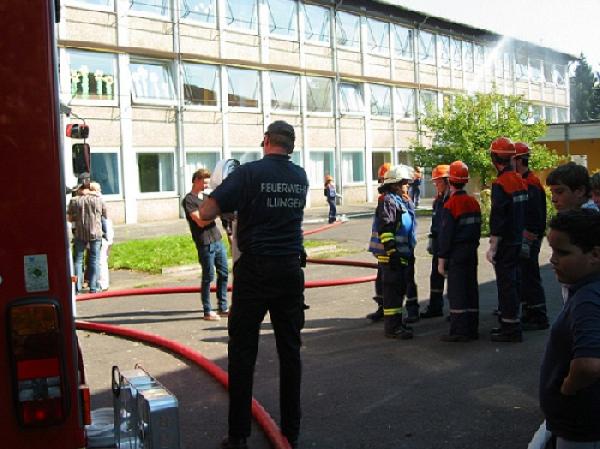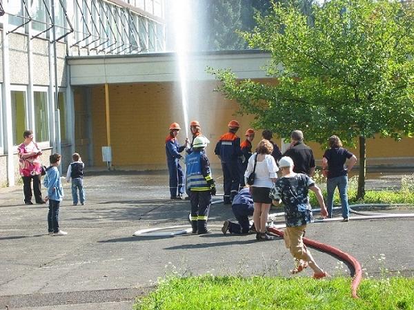 Unter dem Motto "Alarm, die Schule brennt!" mussten die Jugendfeuerwehrleute, unter Ihnen auch Schüler der Förderschule, einen angenommenen Brand im Bereich des Schulgeländes löschen. Dem hoch interessierten Publikum aus Schulleitung, Eltern und Schülern wurde eine gelungene Schauübung präsentiert. Anschließend waren die Schülerinnen und Schüler selbst zu Spiel und Spaß gemeinsam mit der Jugendfeuerwehr eingeladen.