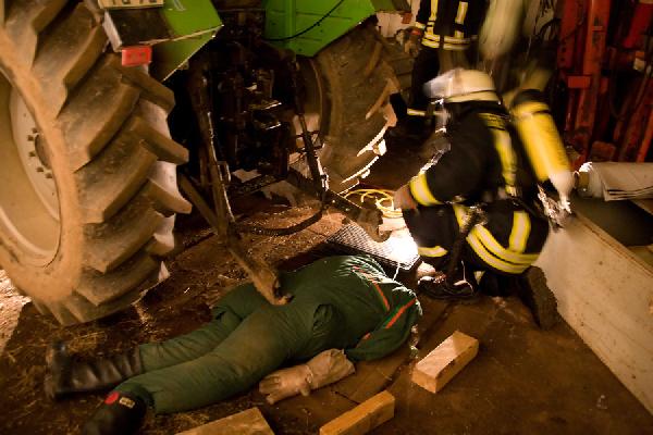 Mehrere Szenarien gleichzeitig mussten dabei von den 33 Einsatzkräften bewältigt werden: In einem Gebäude des Hofes wurde ein Brand angenommen. In den völlig verqualmten Räumen galt es, vor der eigentlichen Brandbekämpfung eine noch vermisste Person zu finden und ins Freie zu retten. Ausgerüstet mit Atemschutzgeräte und durch die starke Verqualmung keine leichte Aufgabe für die Feuerwehrleute. Zeitgleich musste auch der Löschangriff vorbereitet werden.
