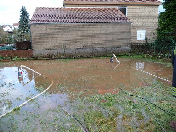 Und auch in Wiesbach musste die Feuerwehr kurz darauf ausrücken: Dort war das Bachbett aus den Fugen geraten und hatte mehrere Grundstücke überflutet. Das Wasser begann nun, in die Keller der anliegenden Häuser zu laufen. Mit mehreren Pumpe konnte der Wasserstand gehalten werden, so dass ein überschwemmen der Keller verhindert werden konnte.