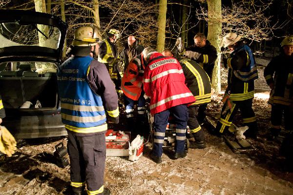 Nach dem Eintreffen wurde die im Dunkeln liegende Einsatzstelle mit Scheinwerfern ausgeleuchtet und die Fahrzeugbatterie abgeklemmt. Der inzwischen ebenfalls eingetroffene Notarzt entschied dann nach einer Untersuchung des Patienten, dass aufgrund des Verletzungsmusters keine technische Rettung erforderlich war. Der Patient konnte mit Unterstützung der Feuerwehr aus dem Fahrzeug befreit und zum Rettungswagen gebracht werden.