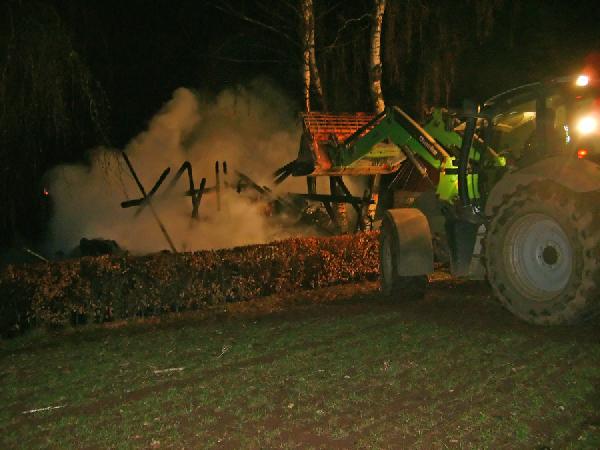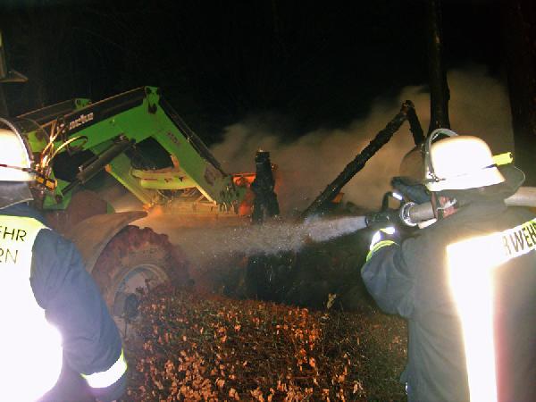Mit einem Schlepper wurden die abgelöschten Holzscheide auseinander gedrückt, um an versteckte Glutnester zu gelangen. Ausser dem Holzdepot hatte das Feuer auch auf mehrere Bäume übergegriffen und diese in Mitleidenschaft gezogen.