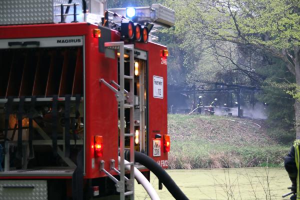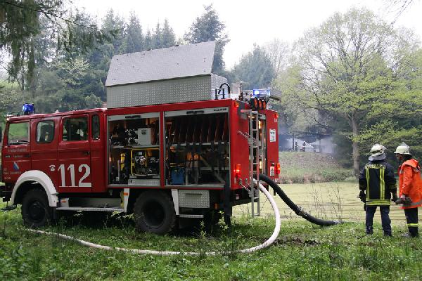 Beim Eintreffen der Feuerwehr stand die an einem Fischweiher gelegene und überwiegend in Holzbauweise errichtete Hütte im Vollbrand, das Feuer hatte bereits auf den angrenzenden Baumbestand übergegriffen. Ein Trupp unter Atemschutz begann sofort mit der Brandbekämpfung, mit weiteren Rohren wurde ein weiteres Ausbreiten des Feuers verhindert. Für die Wasserversorgung konnte dabei auf die Weiheranlage zurückgegriffen werden. Der Feuerwehr gelang es rasch, den Brand unter Kontrolle zu bringen.