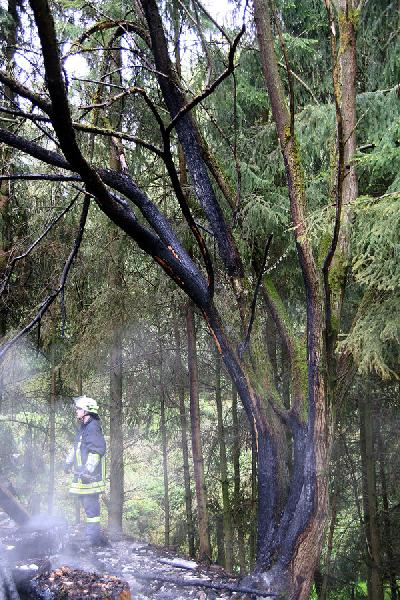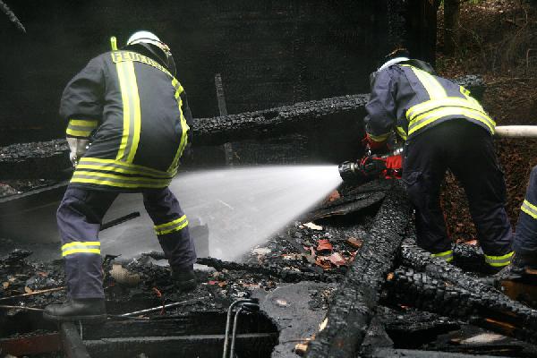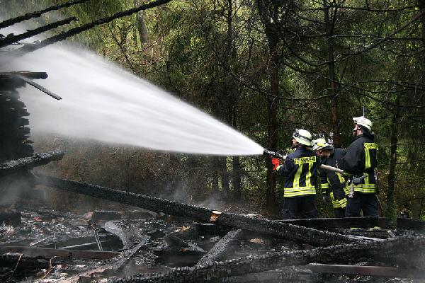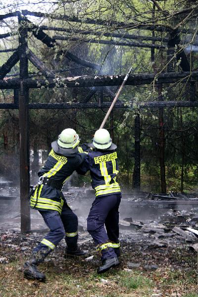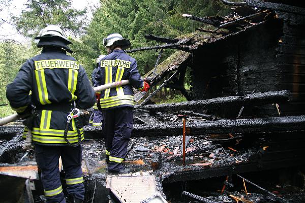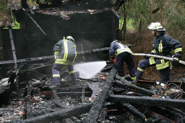 Immer wieder loderten Glutnester unter den Trümmern auf und mussten abgelöscht werden. Die Nachlöscharbeiten zogen sich noch bis gegen 10:00 Uhr hin. Die Hütte brannte durch das Feuer komplett nieder, eine Brandausbreitung und die Entwicklung eines Waldbrandes konnte durch den schnellen Einsatz der Feuerwehr verhindert werden. Die baufälligen Reste drohten einzustürzen und wurden von den Einsatzkräften niedergerissen.