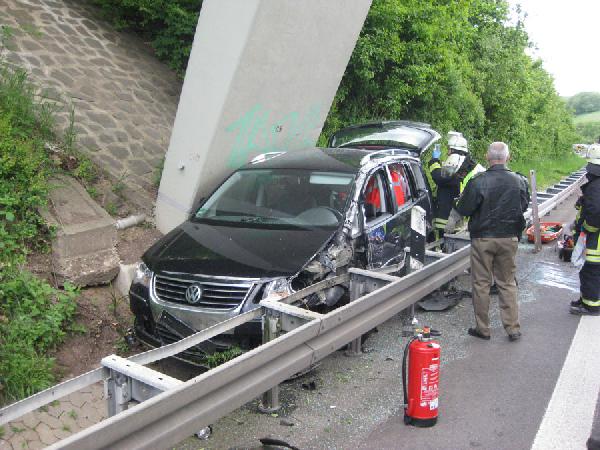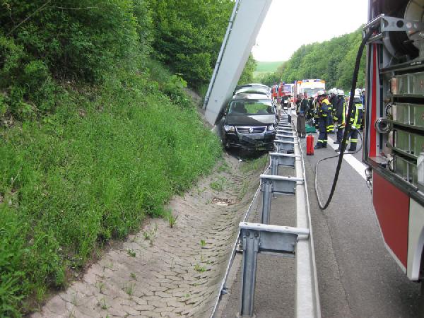 Rettungsassistenten der Feuerwehr übernahmen die weitere medizinische Versorgung der Fahrerin bis zum Eintreffen des Notarztes. Die Unfallstelle wurde in Absprache mit der Polizei gesichert und die rechte Fahrspur gesperrt und der Brandschutz mit Feuerlöschern und der Schnellangriffseinrichtung des Tanklöschfahrzeugs sichergestellt. Zusammen mit dem Rettungsdienst konnte die Frau dann schonend aus dem Fahrzeug befreit werden.