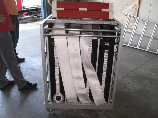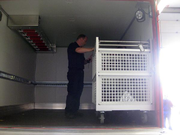 Das von der Wehrführung und Verwaltung entsandte dreiköpfige Abnahmeteam der Feuerwehr Eppelborn, (u. a. mit einem Kfz-Meister und dem hauptverantwortlichen Gerätewart) hatte nun die Aufgabe, die in den Ausschreibungsunterlagen geforderten Positionen zu überprüfen. Zwei Arbeitstage waren nötig, um das Fahrgestell mit der Ausschreibung zu vergleichen und den Aufbau zu kontrollieren. Der Aufbau, bestehend aus einem festem Koffer, zwei Geräteräumen für die Aufnahme der Ausrüstung und einer zweigteilten Ladebordwand soll auf der Ladefläche maximal acht Rollcontainer aufnehmen können. Standardmäßig werden vier davon mit je 500 Meter Schlauchmaterial ständig verlastet sein. Funktionalität und passgenauigkeit der bestellten Rollcontainer wurden mit dem Verlade-, Verzurr- und Sicherungssystem des Fahrzeugaufbaues abgeglichen.