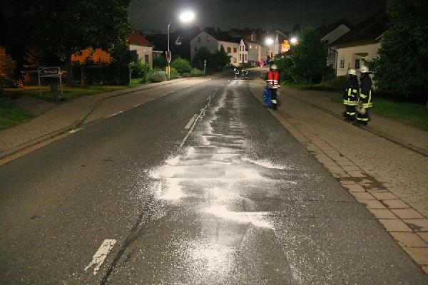 Auf rund 250 Länge mussten die Einsatzkräfte die Fahrbahn in der Hauptstraße reinigen und das Bindemittel aufnehmen. Dabei musste die Hauptstraße zwischen den Einmündungen "Landstuhlstraße" und "Augustinusstraße" voll gesperrt werden.