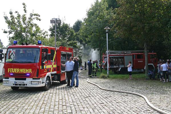 Um Punkt 14 Uhr wurden die Sirenen ausgelöst und nur wenige Minuten später rückte die erste Rettungseinheit an. Auf dem Brühlplatz wurden die Jugendlichen bereits von Wehrführer Hermann Josef Recktenwald, Bürgermeisterin Birgit Müller-Closset und Gemeinde-Jugendbetreuer Karl Paul erwartet. Auch viele Eltern und interessierte Zuschauer hatten sich dort versammelt, um die Übung zu verfolgen.