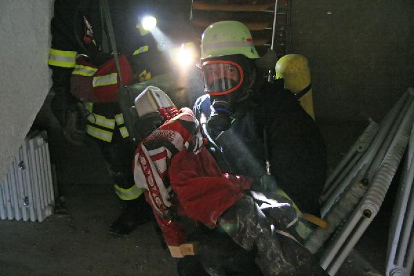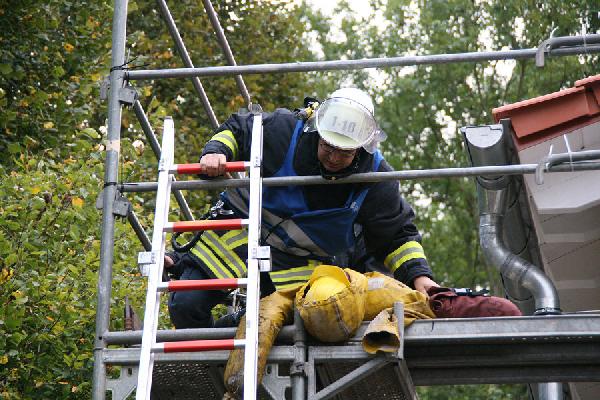 Während am Übungsobjekt mit ersten Löschmaßnahmen begonnen wird, eilen aus allen Richtungen weitere Einheiten herbei. Die recht umfangreiche Einsatzstelle wird in mehrere Abschnitte unterteilt, jeweils mit anderen Aufgabenschwerpunkten: Parallel zum Aussenangriff dringen mit Atemschutzgeräte ausgerüstete Trupps in das Gebäude vor, um die vermissten Personen zu suchen und ins Freie zu bringen. Ausserdem muss im rückwärtigen Gebäudeteil eine Person aufwändig von einem Dach gerettet werden.