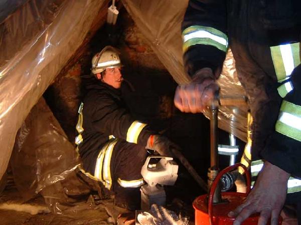 Der Kamin wurde im Beisein des zuständigen Schornsteinfegers kontrolliert ausbrennen gelassen und mit einem Kaminkehrgerät gereinigt. Die Deckendurchführungen und Wandverkleidungen entlang des Kamins wurden ständig auf Wärmeüberschlag überwacht. Wegen der starken Rauchentwicklung an der im Keller gelegenen Revisionsöffnung wurde zeitweise unter Pressluftatmern gearbeitet.