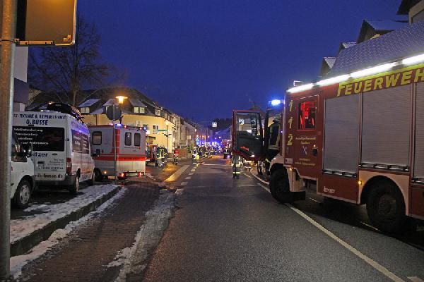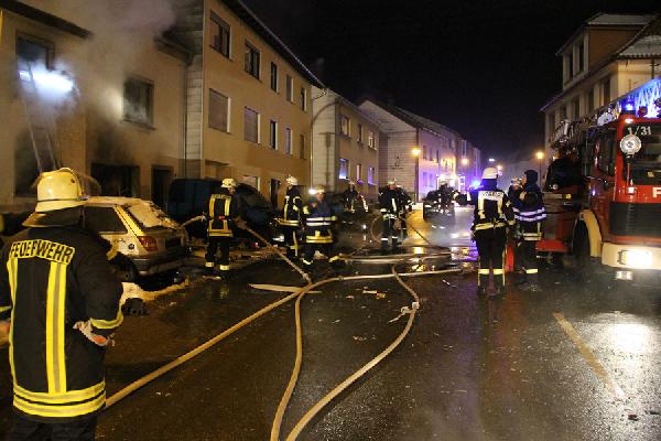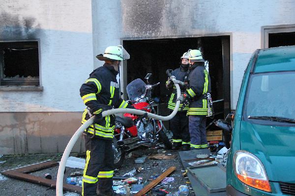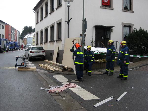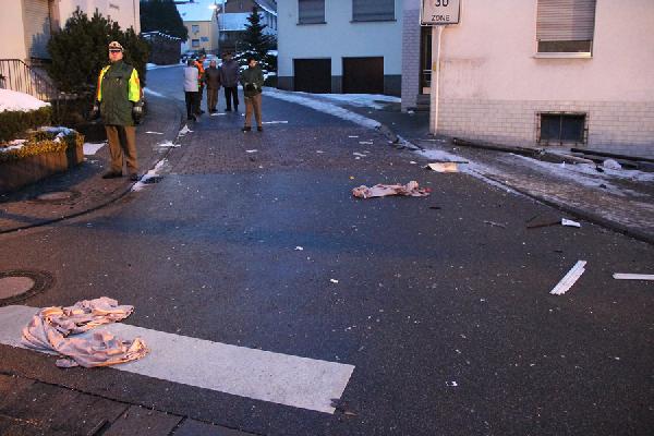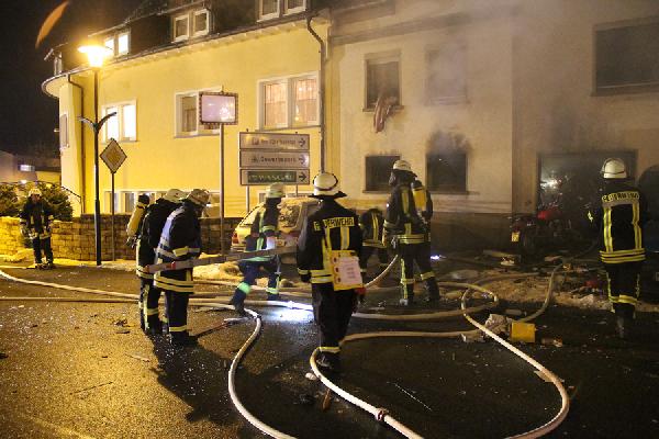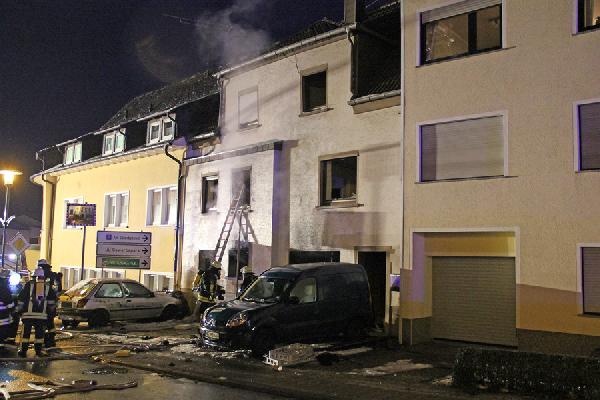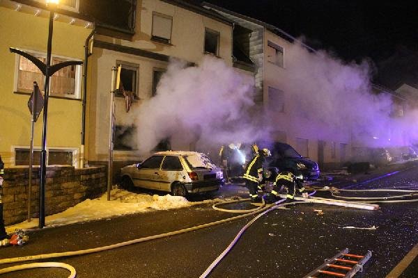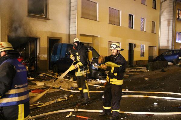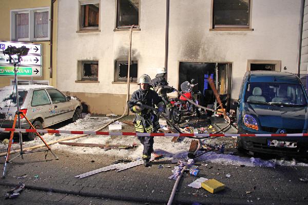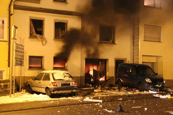 Eppelborn. Eine gewaltige Explosion riss am frühen Sonntagmorgen die Eppelborner Bevölkerung aus dem Schlaf. Fast im ganzen Ort war der gewaltige Knall zu hören. Um kurz vor sieben Uhr lief der erste Notruf bei der zentralen Leitstelle der Polizei ein. Unzählige Anrufer meldeten eine Explosion und einen Brand in einem Wohnhaus in der Dirminger Straße, der Hauptdurchgangsstraße durch die Illtalgemeinde. Das Einfamilienhaus, das direkt an das Seniorenheim Sankt Josef in der Eppelborner Ortsmitte angrenzt, brannte beim Eintreffen der ersten Feuerwehrkräfte vollständig. Die Fenster und Türen flogen durch die Druckwelle der Explosion zum Teil bis auf die andere Straßenseite und beschädigten dort parkende Autos und eine Schaufensterscheibe.