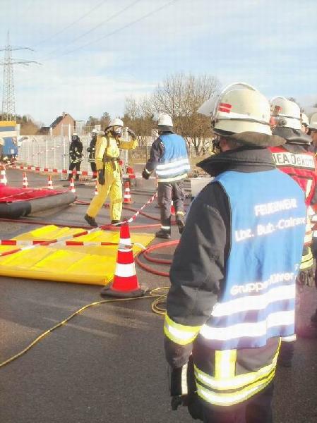 Das bereits Erlernte konnten beide Löschbezirke in einer Übung des Gefahrstoffzuges des Landkreises Neunkirchen am 12. April 2013 in Spiesen unter Beweis stellen. Bei dieser Übung auf dem Gelände einer Firma im Industriegebiet Spiesen, wurde ein austretender Stoff nach einem Unfall von der Ladefläche eines Transporters angenommen und realitätsnah durch Farbstoff dargestellt. Nach dem Einsatz der Arbeitsgruppe in Chemieschutzanzügen mussten diese Kameraden an der Dekonstelle gesäubert werden. Die Wasserversorgung dieses Aufgabenbereiches war Aufgabe des Löschbezirkes Bubach-Calmesweiler. Ebenso die Bereitstellung von Elektromaterial zur Stromversorgung.