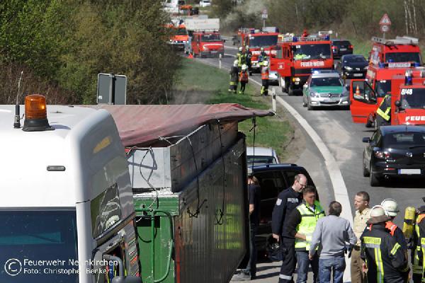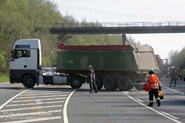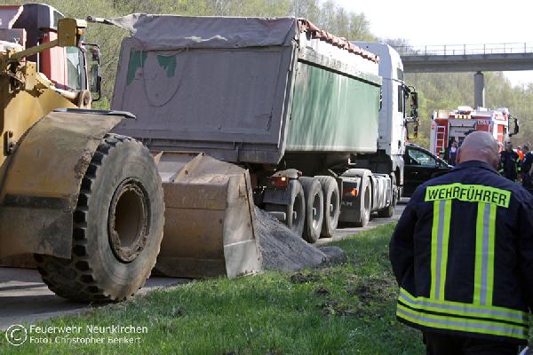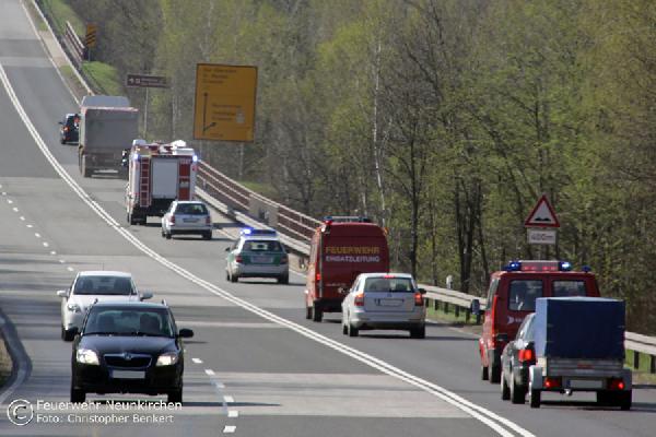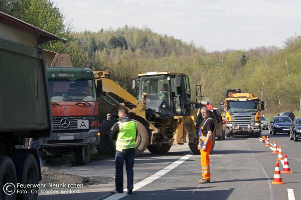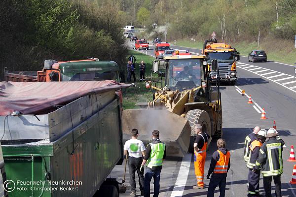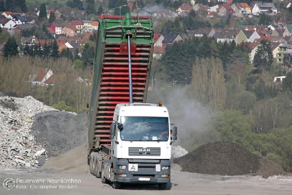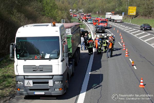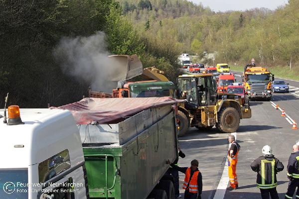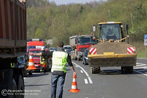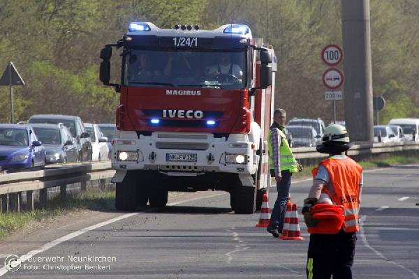 Neunkirchen. Einen nicht alltäglichen Einsatz hatten Neunkircher Feuerwehr und Polizei am 23. April 2013 zu verzeichnen. Die Löschbezirke Innenstadt und Wellesweiler wurden kurz nach 15:00 Uhr zu einem vermeintlich brennenden Lkw gerufen, der kurz vor der Auffahrt Neunkirchen City zur A 8 in Richtung Saarlouis auf der B 41 stand.