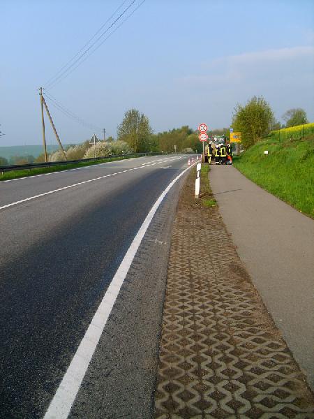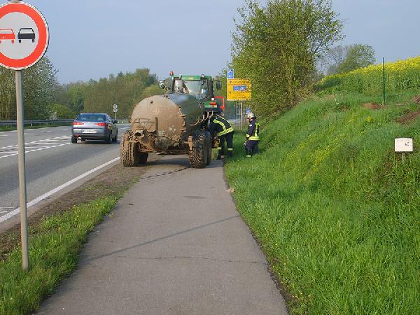 Die ebenfalls gegen 07:45 Uhr alarmierten Einsatzkräfte der Feuerwehr aus dem Löschbezirk Bubach-Calmesweiler sicherten die Einsatzstelle ab und nahmen das dem Traktor auslaufendes Öl mit Bindemittel auf. Da die Ölspur auf der viel befahrenen Bundesstraße eine Breite von rund einem Meter hatte, übernahmen Polizei und Straßenmeisterei die Verkehrsführung um die rutschige Gefahrenstelle.