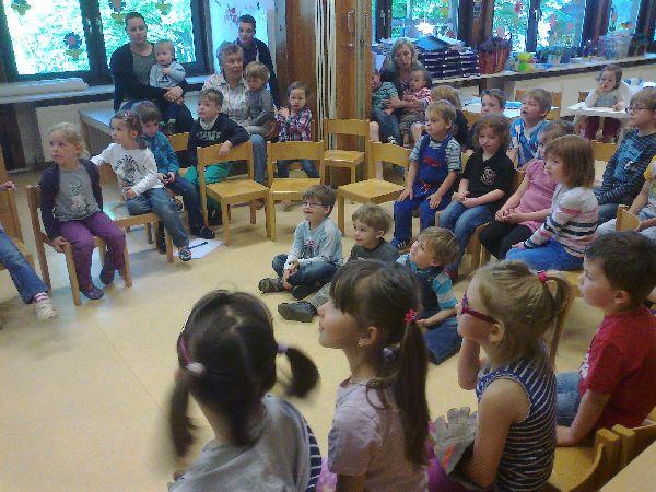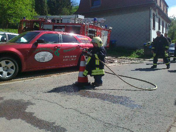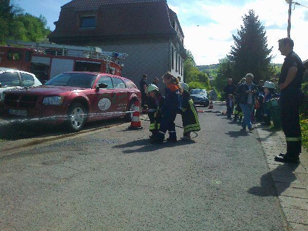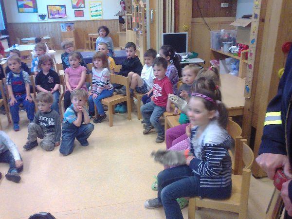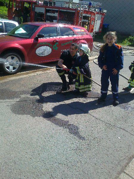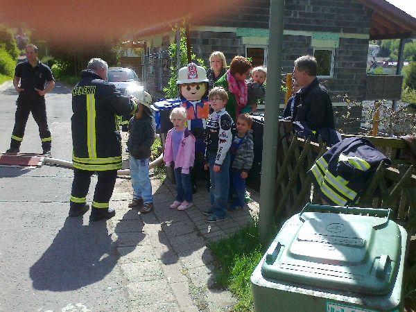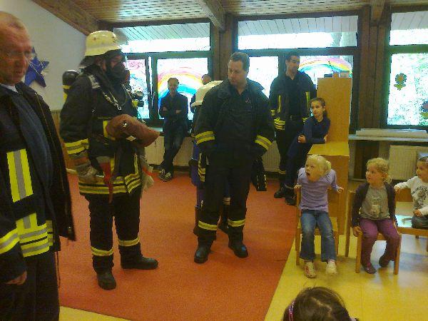 Hans-Werner Guthörl und Guido Kuhn zeigten den Kindern, wie ein richtiger Feuerwehrmann im Einsatz aussieht, was die Feuerwehr so macht und vermittelten den Kindern wie sie sich bei Brand und Notfällen zu verhalten haben. Es war eine erstaunliche Vorbildung bei den kleinen Bürgern vorhanden, was wohl auf die regelmäßigen jährlichen Besuche der Feuerwehr, sowie auf eine sehr gute Arbeit durch die Erzieherinnen, zurückzuführen ist. Die Kinder durften nun die Jacken, Helme und Handschuhe der Feuerwehrleute anziehen. Dies wurde gerne von den Kleinen angenommen. Im Anschluss ging es zum praktisch, spielerischen Teil des Besuches der Feuerwehr. Zuerst wurde eine Räumungsübung mit den Kindern durchgeführt, die einen sehr guten Ablauf hatte. Weitere Aktivitäten warteten aber noch auf die Kinder.
