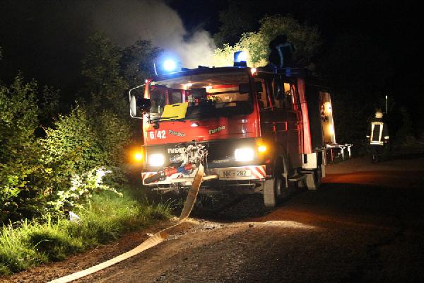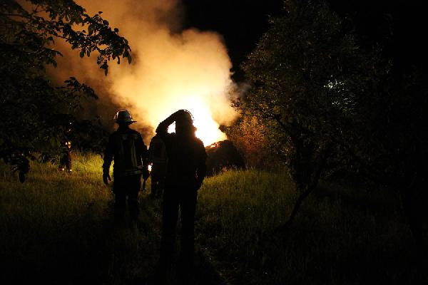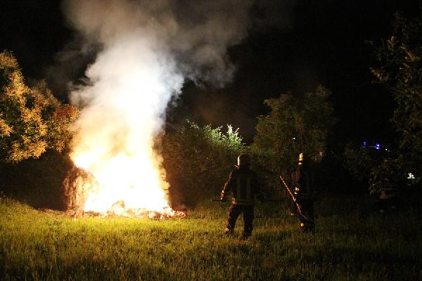 Beim Eintreffen der Einsatzkräfte brannte ein großer aufgeschichteter Heuhaufen hinter einer Hecke an der Zufahrt zum Marienhof. Mit einem C-Rohr konnten die Flammen schnell gelöscht und der Brand unter Kontrolle gebracht werden. Zur Wasserversorgung mussten die Einsatzkräfte eine rund 120 Meter lange Schlauchleitung von der Siedlung "Alte Nachtweide" bis zur Einsatzstelle verlegen.
