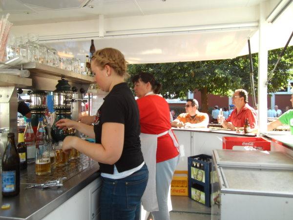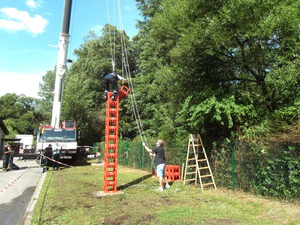 Die ersten Gäste fanden sich dann wieder am Sonntagmorgen zum Frühschoppen ein. Das Wetter war gut und so nach und nach füllten sich die Garnituren und der Bierstand. Der Feuerwehrkamerad Markus Blum organisierte über seinen Arbeitgeber AKV Kranvermietung Günter Hüther e.K aus Zweibrücken einen schweren Kran, der dazu verwendet wurde, das Cola-Kisten stapeln als Sicherungsmaßnahme zu unterstützen. Für die Bereitstellung des Autokranes möchte sich der Löschbezirk Dirmingen bei der Fa. AKV (www.akv-zw.de) bedanken. Markus Blum schaffte selbst am Samstagabend 22 Kisten zu stapeln. Er wurde danach allerdings von seiner Cousine Sarah Blum überboten, die 25 Cola-Kisten stapeln konnte. Die Sicherungsmaßnahmen übernahmen dankenswerterweise die Kameraden des Löschbezirk Bubach-Calmesweiler, die in der Absturzsicherung aktiv sind. Wer 20 Kisten schaffte bekam als kleine Belohnung 1 Meter Bier.
