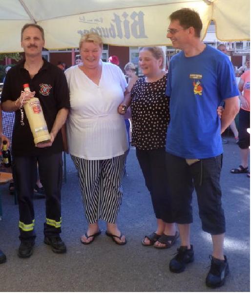 Ortsvorsteher Manfred Klein brachte Herr Köhl von der Bitburger Brauerei mit, der für den Tag der offenen Tür, als Unterstützung des Löschbezirk Dirmingen, ein Fass Bier spendete. Für diese Spende möchten sich die Feuerwehrkameraden bei der Bitburger Brauerei (www.bitburger.de), vertreten durch Herr Köhl, bedanken. Mittlerweile waren dann auch Feuerwehrkameraden der Feuerwehr Pfaffenthal aus Luxemburg eingetroffen. Löschbezirksführer Bernd Detzler begrüßte die Gäste aus Pfaffenthal, die jedes Jahr gerne nach Dirmingen kommen. Bürgermeisterin Birgit Müller-Closset, Chefin der Feuerwehr in der Gemeinde Eppelborn, fand auch an diesem Tag wieder den Weg zum Feuerwehrfest nach Dirmingen. Ihre freundliche, offene Art wurde von den Dirminger Bürger gut angenommen und es machte den Eindruck, dass es der Rathauschefin gut in Dirmingen gefallen hat.