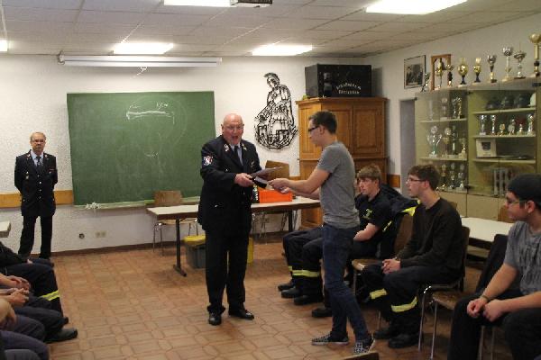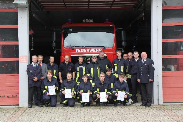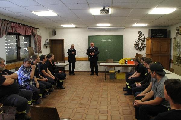 Wehrführer Klaus Theis und sein Stellvertreter Christian Holz waren persönlich gekommen, um sich vom Ausbildungserfolg zu überzeugen. Sie konnten nach der Auswertung der Fragebogen gratulieren: Alle haben bestanden.