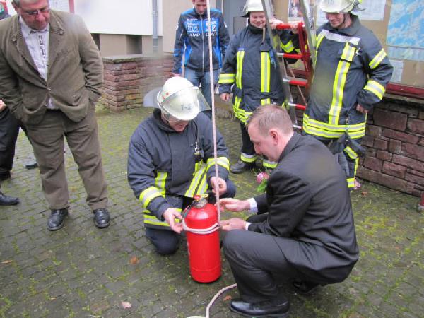 Mit zahlreichen Gerätschaften waren sie angerückt und hatten während der Zeremonie vor der Kirche schon die traditionellen Aufgaben vorbereitet, mit der das Brautpaar die Feuerwehr-Ehefähigkeit unter Beweis stellen musste.