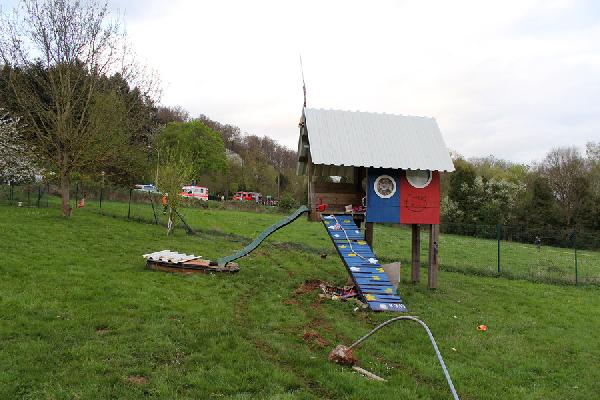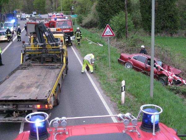 Die Feuerwehr klemmte die Fahrzeugbatterie ab und stellte den Brandschutz sicher. Mit der Seilwinde des Rüstwagens wurde das Unfallfahrzeug dann geborgen und bis zur Landstraße geschleppt, wo es einem Bergungsunternehmen übergeben wurde. Dabei hat sich wieder einmal die Geländegängigkeit dieses Fahrzeugs bewährt.