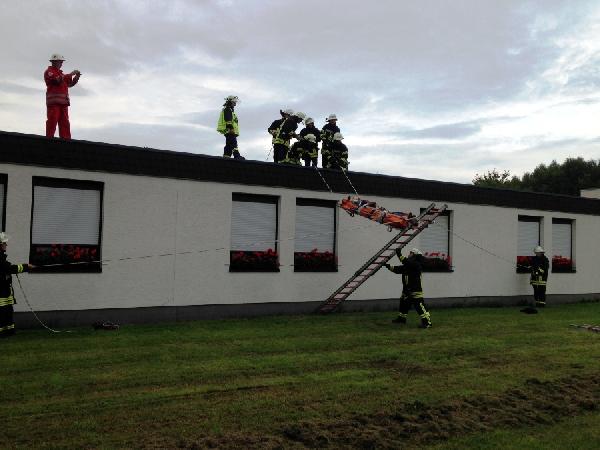 Im letzten Teil der Übung wurde simuliert, dass eine Person auf dem Dach des Wohnbereich 1 zusammengebrochen sei und sich Rücken- und Nackenverletzungen zugezogen hatte. Diese musste zuerst von Ersthelfern des DRK stabilisiert und erstversorgt werden, bevor er gemeinsam auf die Vakuummatratze umgebettet werden und mit Hilfe eines Leiterhebels vom Dach des Gebäude gerettet werden konnte.