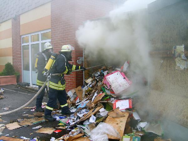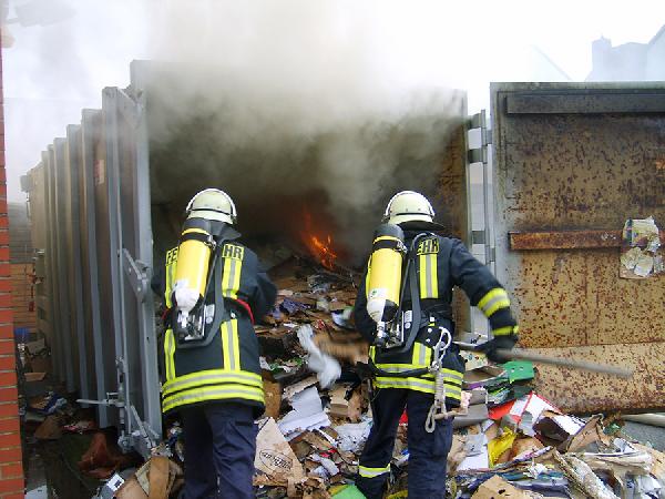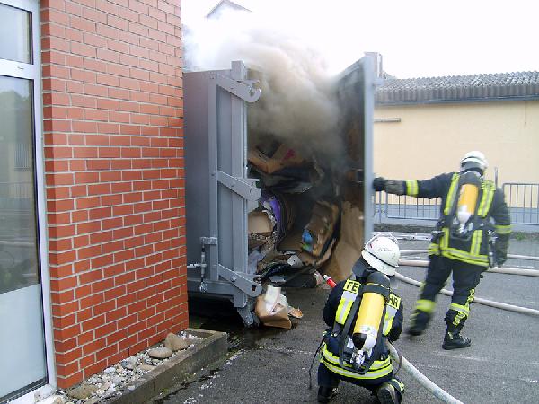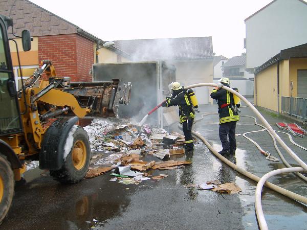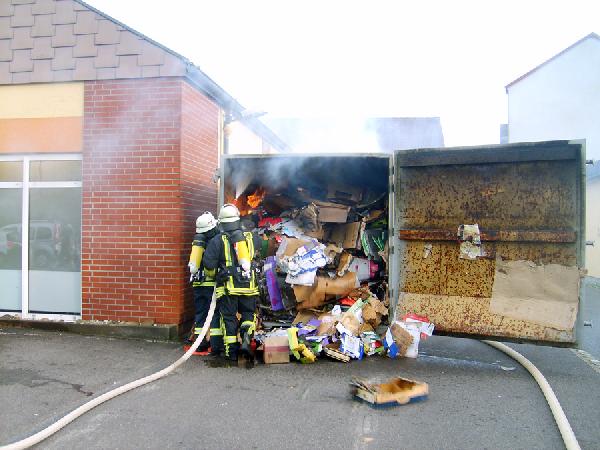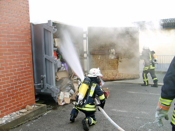 Beim Eintreffen der Einsatzkräfte drang dichter Brandrauch aus den Einwurf- und Entleerungsöffnungen des Containers. Das Feuer hatte noch nicht auf Bereiche außerhalb des Containers übergegriffen. Mit einem C-Rohr wurde das Feuer zuerst durch die Einfüllöffnung abgelöscht, bevor der Container geöffnet werden konnte.