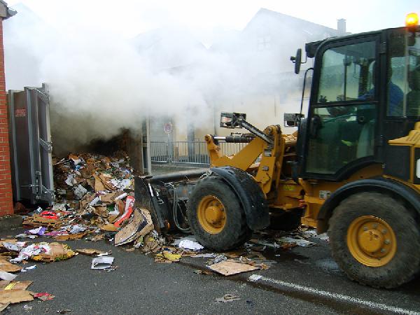 Der gepresste Inhalt musste Stück für Stück entfernt werden, um alle Glutnester zu finden und abzulöschen. Dabei bekamen die Einsatzkräfte Unterstützung durch den Radlader des Gemeindebauhofes. Ohne diesen hätte das Ausräumen des Containers in Handarbeit wohl mehrere Stunden in Anspruch genommen. Mit dem Radlader konnten die Kartonagen auf dem Parkplatz auseinander gezogen und abgelöscht werden. Dabei kam zum Teil auch Löschschaum als Netzmittel zum Einsatz.