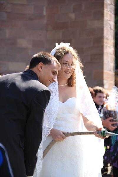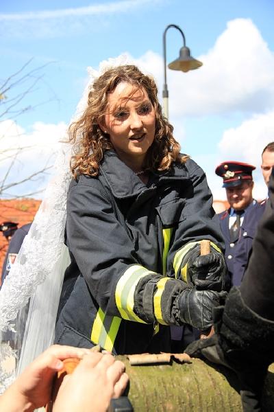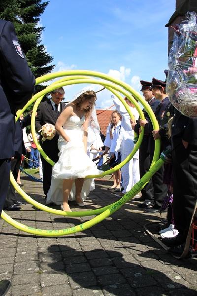 Aus diesem Grund trafen sich die Feuerwehrleute aus dem Löschbezirk Uchtelfangen, dem Simon angehört und die Kameraden aus Humes um dem Brautpaar zu gratulieren und ein paar Aufgaben zu stellen. Alle Feuerwehrangehörigen standen Spalier und führten so die frisch gebackenen Eheleute zu den einzelnen Stationen.