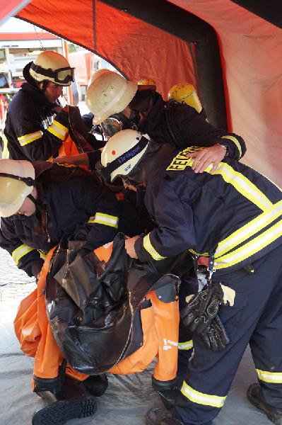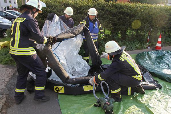 Während sich die Übung in der "heißen" Phase befand, zeigte sich plötzlich ein Problem, mit dem niemand gerechnet hatte: Ein Heißluftballon überfuhr die Einsatzstelle im Tiefflug. "Bei dieser Einsatzlage muss zu Beginn mit einer explosionsgefährlichen Atmosphäre gerechnet werden. Eine offene Feuerstelle (Gasbrenner) über einer Ex-Zone mit Menschen birgt ein enormes Schadenspotential", so der stellvertretende Wehrführer Christian Holz.