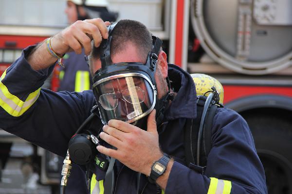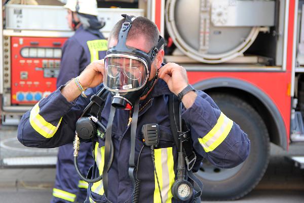 Wie bei solchen Lagen üblich, wird daraufhin zuerst der zuständige Löschbezirk Bubach-Calmesweiler alarmiert. Bei der Lageerkundung durch die ersten Kräfte ist schnell klar: Der rote Rauch ist kein normaler Brandrauch, sondern muss durch eine noch unbekannte Chemikalie in der mit Bauschutt beladenen Mulde verursacht werden. Während die Einsatzkräfte den Einsatzort weiträumig absperren und unter Atemschutzeinsatz nach betroffenen Menschen suchen, wird durch den Einsatzleiter der Gefahrstoffzug nachalarmiert.
