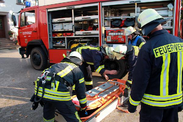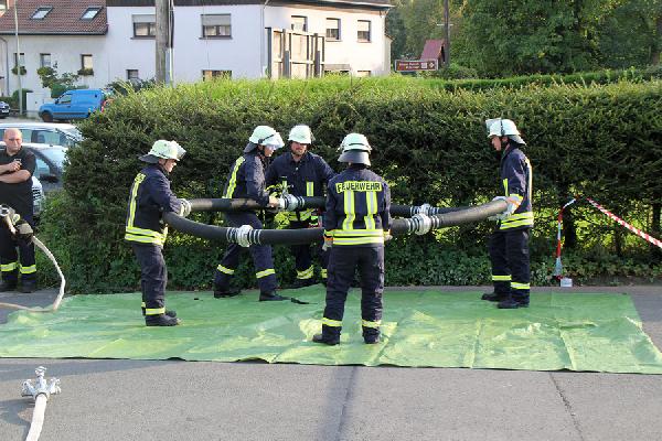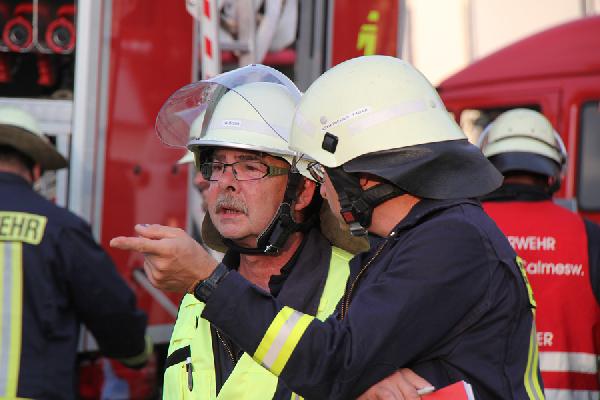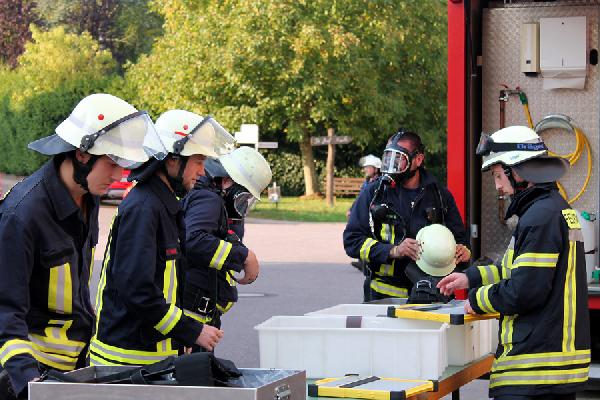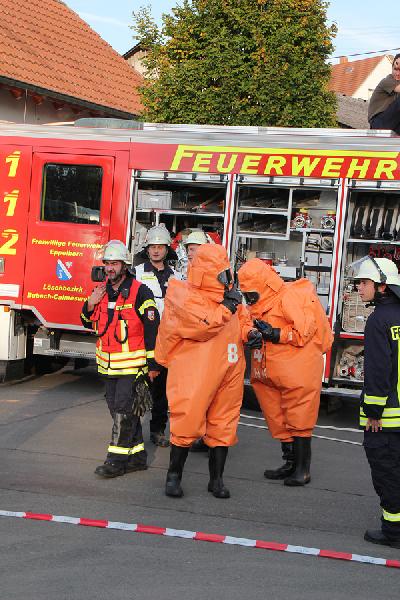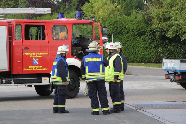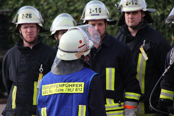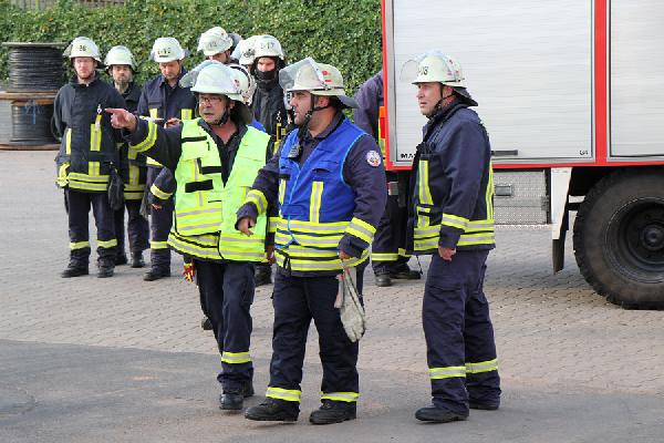 In einer kurzen Nachbesprechung im Gerätehaus in Bubach-Calmesweiler haben der Löschbezirksführer und Einsatzleiter Wolfgang Braun und der Gefahrstoffzugführer des Kreises Neunkirchen im Vorab ein kurzes Résumé an alle Übungsteilnehmer gegeben. Eine Nachbesprechung mit den Führungskräften des Gefahrstoffzuges zur genauen Übungsanalyse wird noch durchgeführt.