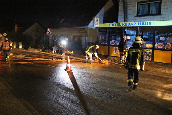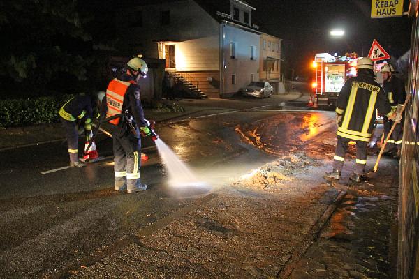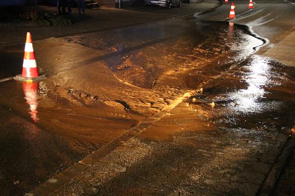Die um 03:35 Uhr alarmierten Einsatzkräfte aus dem Löschbezirk Wiesbach sicherten die Fahrbahn und informierten den Bereitschaftsdienst des Wasserversorger, der die Leitung abschieberte. Nachdem die Fahrbahn vom ausgespülten Sand befreit war, war der Einsatz für die Feuerwehr beendet. Für die Reparaturarbeiten muss die Leitung jetzt freigelegt werden.