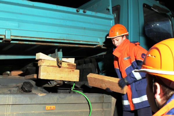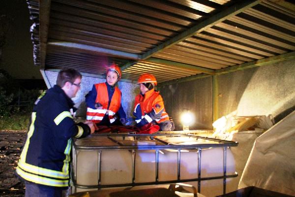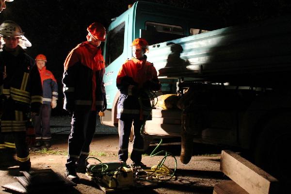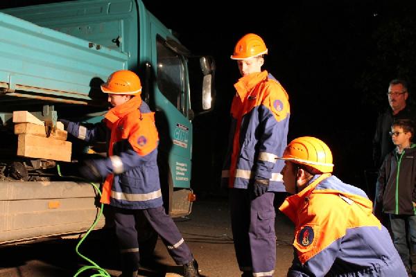 Ein vierter Arbeiter wurde beim Abladen von Baumaterialien zwischen Kipper-Mulde und Fahrgestell eines LKW eingeklemmt. Die Person wurde von den Jugendlichen professionell unter Einsatz von Hebekissen befreit und gerettet.