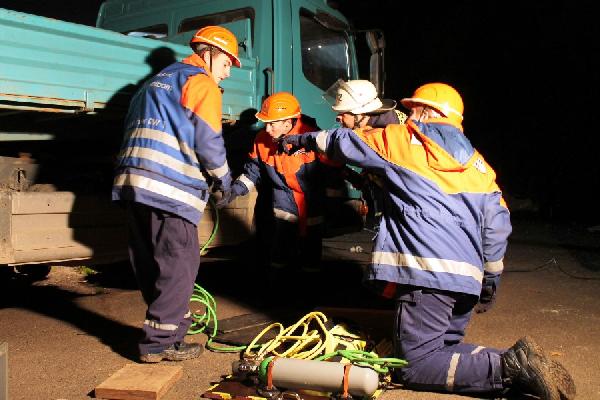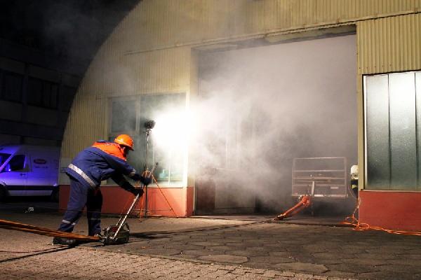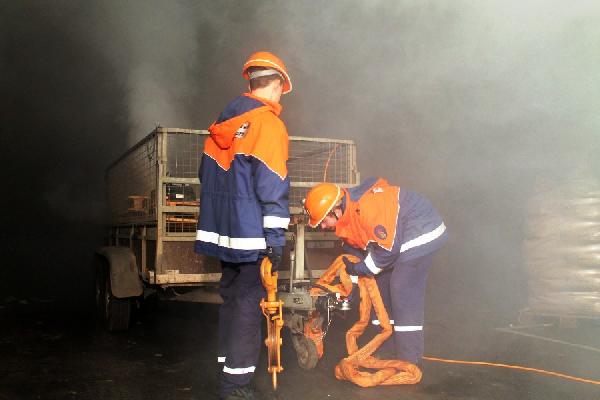 Zuerst musste wegen den der eingesetzten Dunkelheit die Einsatzstelle weiträumig ausgeleuchtet werden. Hierzu kamen mehrere transportable, in den Fahrzeugen fest eingebaute Strahler und ein Powermoon, welcher im Löschbezirk Bubach-Calmesweiler stationiert ist zum Einsatz. Zeitgleich mussten drei vermisste Arbeiter durch mehrere Suchtrupps gefunden werden.