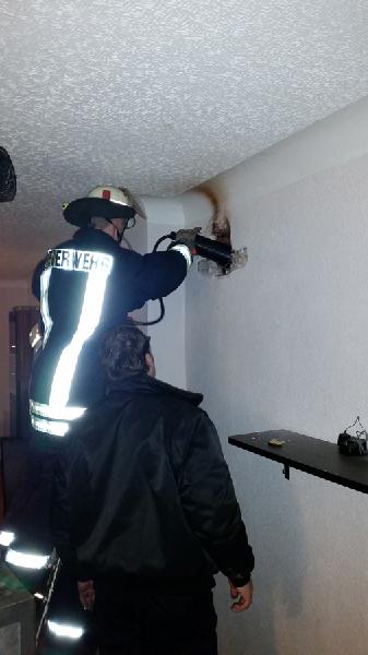 Die gegen 06:16 Uhr alarmierten Einsatzkräfte aus den Löschbezirken Humes und Wiesbach konnten einen Schwelbrand in einem Holzbalken bestätigen. Der betroffene Bereich lag in unmittelbarer Nähe der Kernbohrung, die für ein Abgasrohr eines Holzofens angefertigt worden war. Der Balken musste freigelegt gelegt werden, um feststellen zu können, wie tief der Brand schon ins Holz eingedrungen war.
