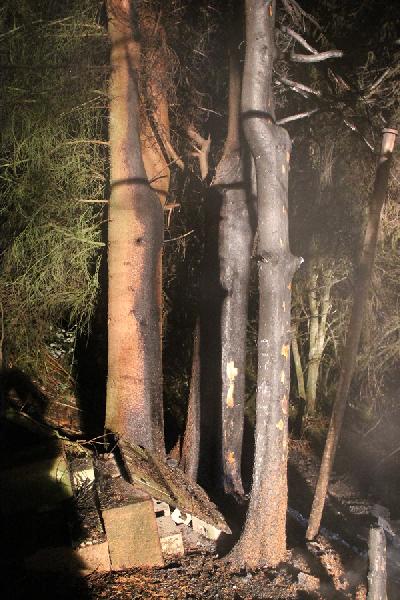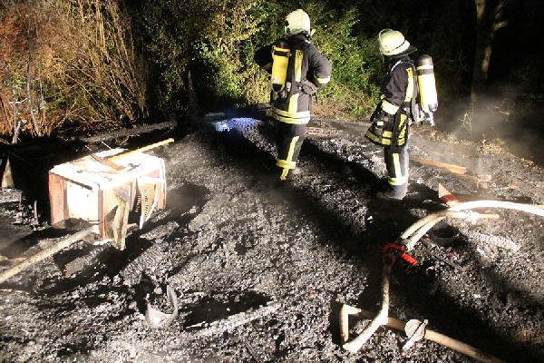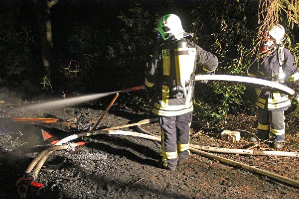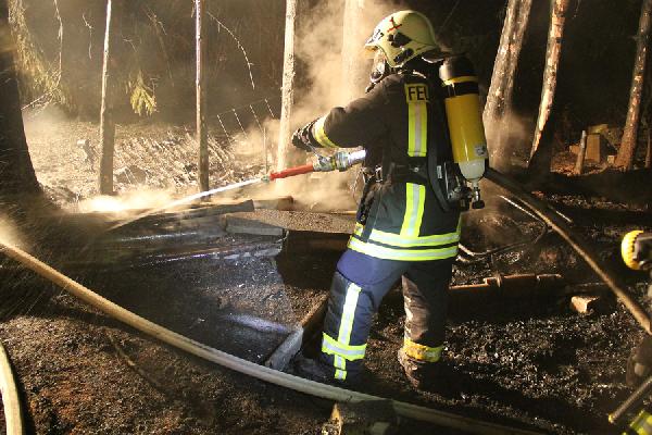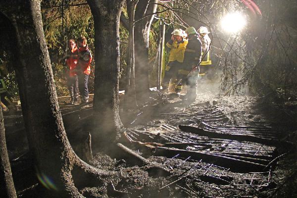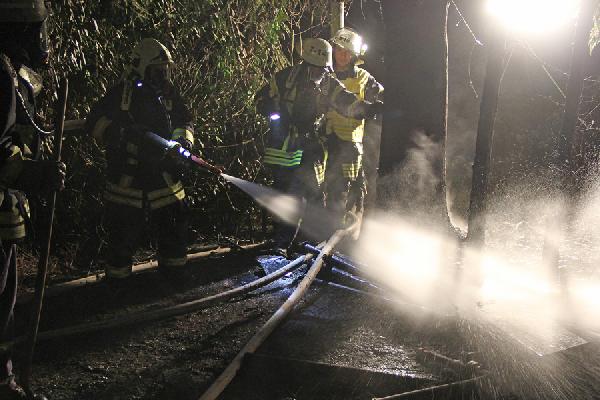 Über rund 300 Meter mussten die Einsatzkräfte eine Schlauchleitung querfeldein bis zur abgelegen und nur zu Fuß zugänglichen Einsatzstelle verlegen. Mit zwei C-Rohren und ausgerüstet mit unter Atemschutz konnten die Einsatzkräfte das Feuer löschen, aber nicht verhindern, dass die Hütte komplett niederbrannte. Auch die in unmittelbarer Nähe stehenden Bäume wurden durch die Hitze des Feuers in Mitleidenschaft gezogen. Ein weiteres Ausbreiten der Flammen konnte aber durch den schnellen Einsatz verhindert werden.