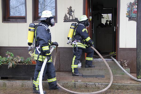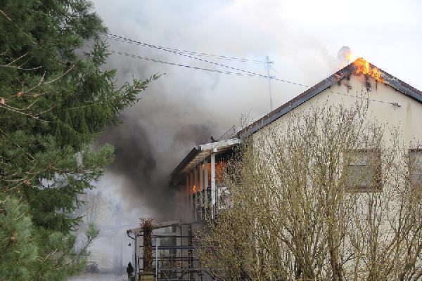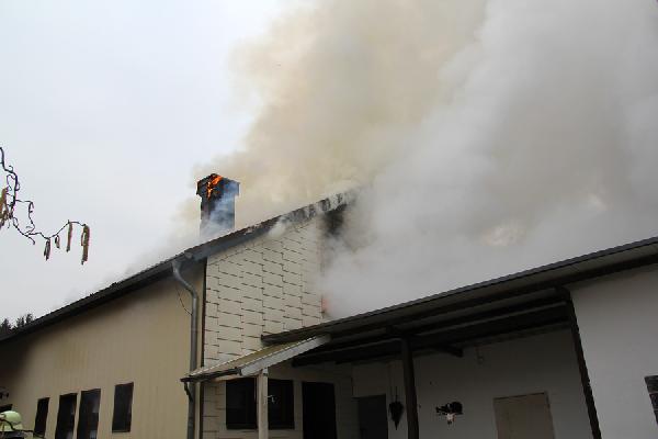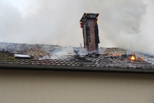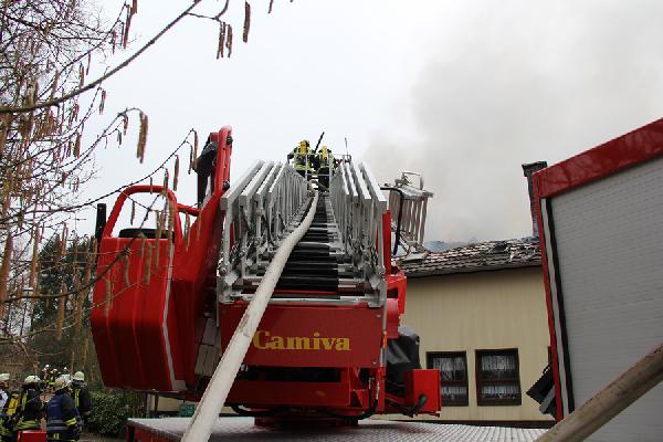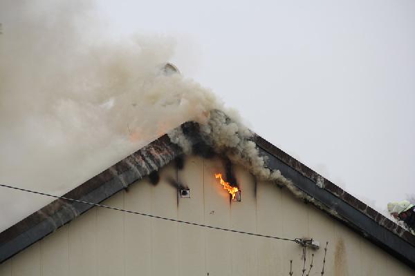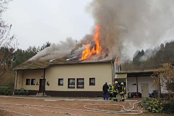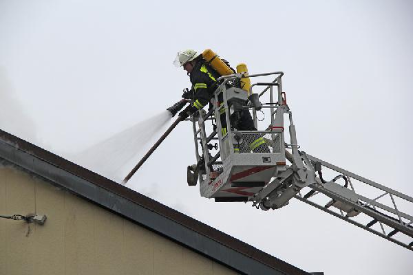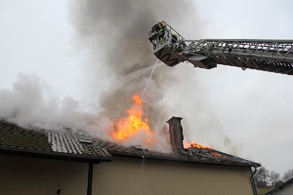 Beim Eintreffen der ersten Kräfte aus den Löschbezirken Dirmingen und Eppelborn hatte das Feuer bereits die Dachhaut durchdrungen, eine dichte Rauchsäule stand gut sichtbar über der Einsatzstelle. Erste Trupps versuchten noch, in einem Innenangriff das Feuer unter Kontrolle zu bringen, der Umfang des Brandes machte dies aber unmöglich. Über die Drehleiter aus Illingen wurde daraufhin mit der Brandbekämpfung von außen begonnen.