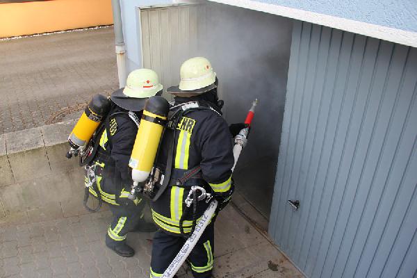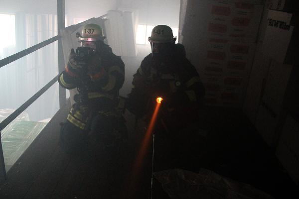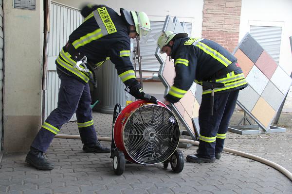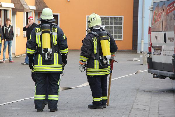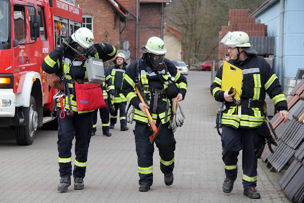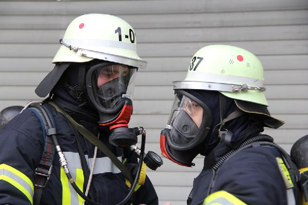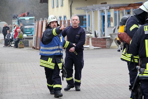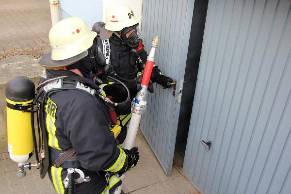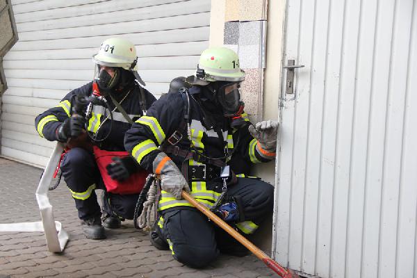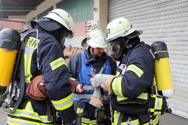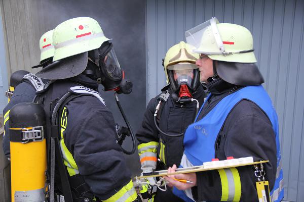 In einer Gewerbehalle war nach den Vorgaben der Übungsleitung ein Brand ausgebrochen, mehrere Personen sollten sich noch in dem Gebäude aufhalten. Mit Atemschutzgeräten ausgerüstet beginnen die ersten Trupps mit der Suche. Gleichzeitig wird vor dem Gebäude die Wasserversorgung aus einem Hydranten aufgebaut.
