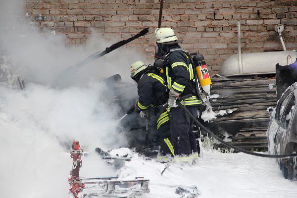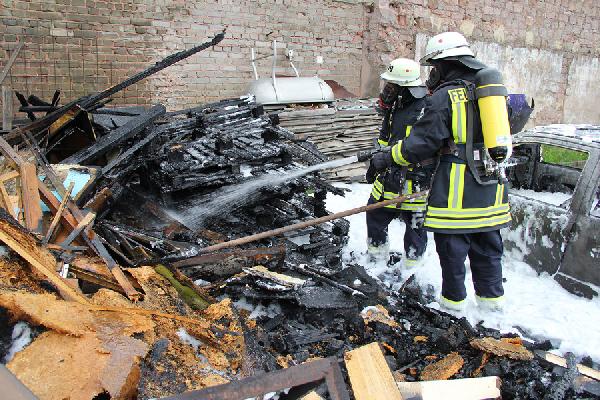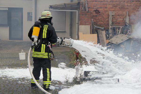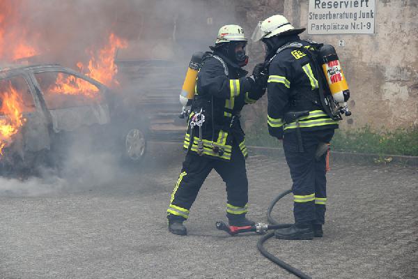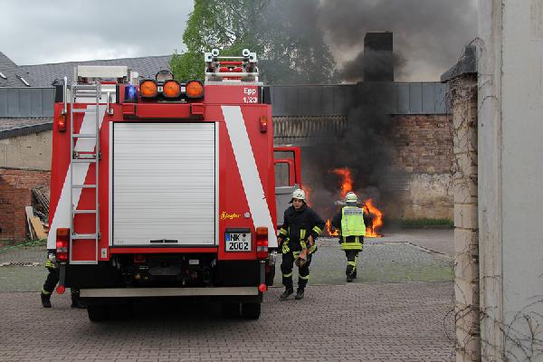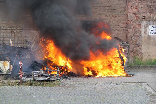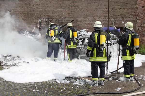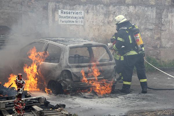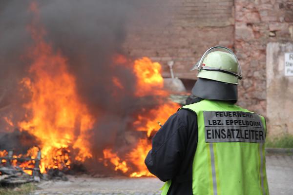 Eppelborn. Dichter Rauch steigt am Vormittag des 09. Mai 2015 hinter einem Geschäftshaus am Kirchplatz in Eppelborn auf. Ein Palettenstapel ist im Hinterhof, unmittelbar hinter dem Pfarrsaal in Brand geraten. Anwohner und Passanten, einer davon ein Feuerwehrmann, die auf das Feuer aufmerksam geworden waren, versuchen noch, mit einem Gartenschlauch und mehreren Feuerlöschern den Brand zu löschen. Doch die Flammen sind bereits zu groß: Die Löschversuche bleiben erfolglos und können nicht verhindern, dass das Feuer auf einen Twingo übergreift.