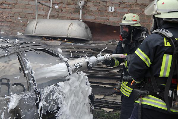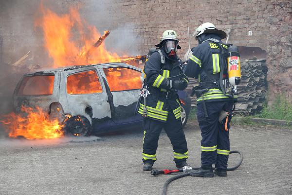 Bei Ankunft der Einsatzkräfte aus den Löschbezirken Eppelborn und Hierscheid stehen der Pkw und der Palettenstapel im Vollbrand, die Flammen schlagen meterhoch. Ausgerüstet mit Atemschutzgeräten beginnt der Angriffstrupp mit der Brandbekämpfung. Mit Wasser können die Flammen niedergeschlagen werden. Schließlich werden der Twingo und der Palettenstapel mit Löschschaum geflutet, da das Feuer immer wieder aufflammt.