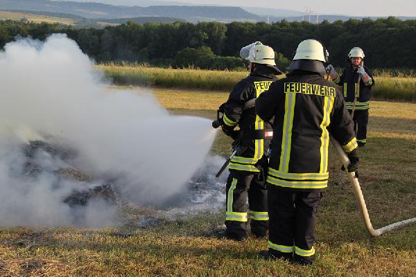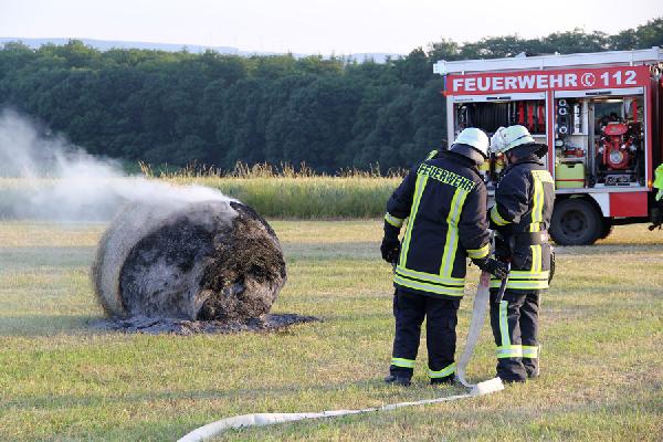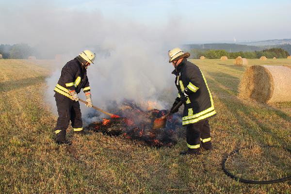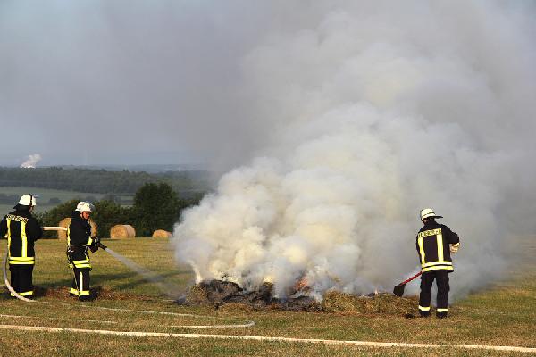 Die Einsatzkräfte aus den Löschbezirken Hierscheid und Eppelborn fanden bei ihrem Eintreffen zwei brennende Rundballen vor, von denen einer bereits größtenteils herunter gebrannt war. Mit Dunghaken wurden die Ballen auseinander gezogen und kontrolliert abbrennen gelassen. Reste wurde dann mit einem C-Rohr abgelöscht.