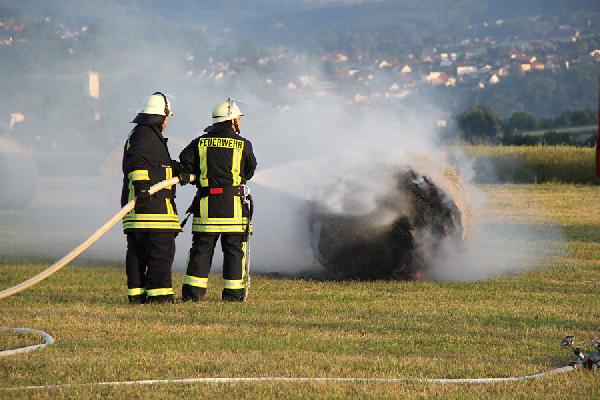 Hierscheid. Zwei Rundballen standen am Morgen des 14. Juni 2015 auf dem Elmersberg in Hierscheid in Flammen, unweit der dortigen Windenergieanlage. Spaziergänger hatten die Flammen am frühen Morgen bemerkt und die Feuerwehr verständigt.