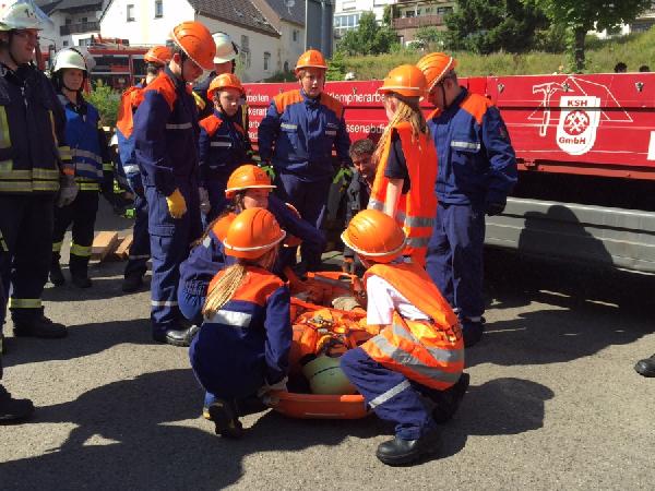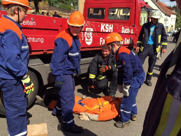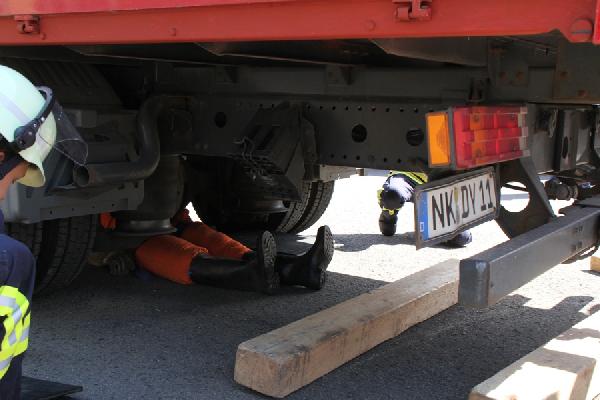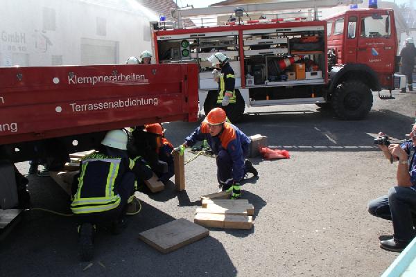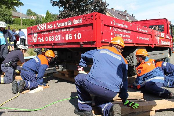 Da für die Rettung der eingeklemmten Person schweres Gerät benötigt wurde rückte aus dem Löschbezirk Eppelborn der Rüstwagen an. Mit Unterstützung der Löschbezirke Habach und Bubach-Calmesweiler wurde der LKW mit pneumatischen Hebekissen angehoben, mit Rüstholz unterbaut und abgesichert, und die eingeklemmte Person sicher befreit. Der Löschbezirk Bubach-Calmesweiler übernahm in der Zeit der Rettung die Sicherstellung des Brandschutzes. Die verletzte Person wurde mit der Schleifkorbtrage an den Verletztensammelplatz gebracht und dort bis zum Eintreffen des Rettungsdienstes weiterhin durch die Mitglieder der Jugendfeuerwehr betreut.
