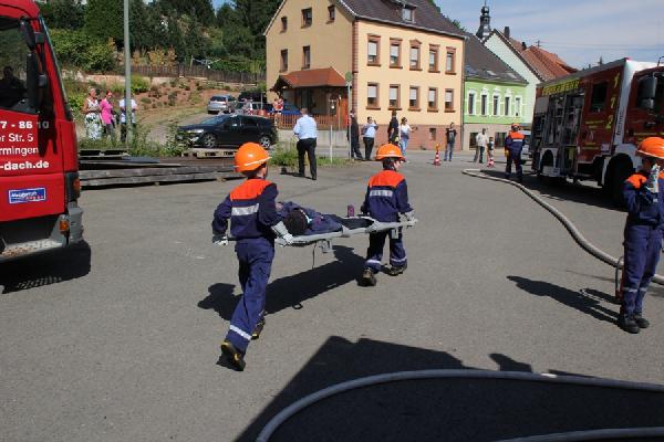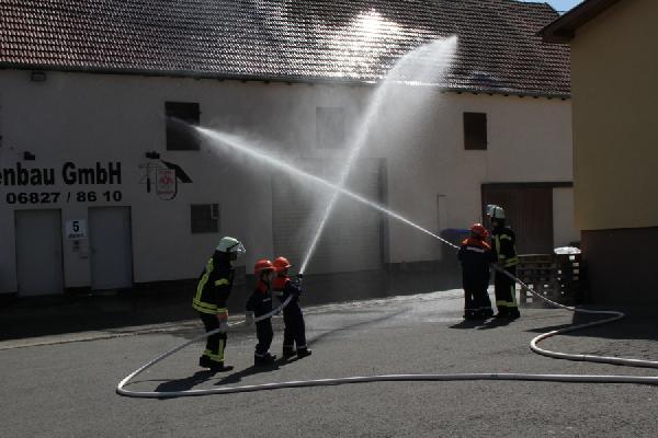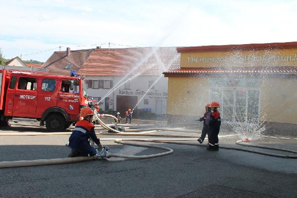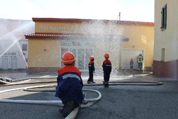 Pünktlich um 16:00 Uhr wurde Großalarm für die Gemeindejugendfeuerwehr ausgelöst. Der zuerst eingetroffene Löschbezirk Dirmingen begann sofort mit der Brandbekämpfung am Getränkemarkt und schirmte das Holzlager der Firma KSH Dach- und Fassadenbau ab.