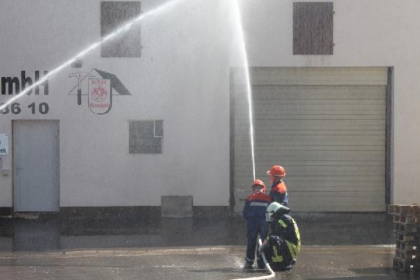 Die inzwischen eingetroffene Jugendfeuerwehr Wiesbach und Humes-Hierscheid begann damit das Gasflaschenlager vom Brand abzuschirmen.