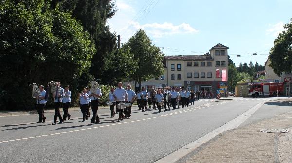 Im Anschluss an die Übung zog die Jugendfeuerwehr samt Ehrengästen und Betreuern anlässlich des 50 Jährigen Jubiläums der Jugendfeuerwehr Dirmingen in einem Festzug in Richtung Feuerwehrgerätehaus. Vorneweg begleitete der Fanfarenzug der Feuerwehr der Stadt Neunkirchen den Festzug musikalisch.