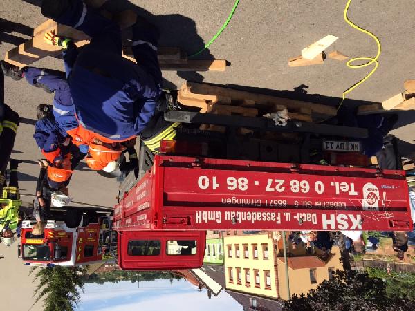 Ausgangslage war ein Brand im Lager des Getränkemarktes Rajanbabu in der Ortsmitte Dirmingen. Durch das Feuer war ein dahinterliegendes Gasflaschenlager sowie das Holzlager der Firma KSH Dach- und Fassadenbau GmbH in Gefahr. Ein Mitarbeiter, der mit Reparaturarbeiten unter einem LKW auf dem Hof der KSH beschäftigt war, bemerkte den Brand und wollte sich schnell in Sicherheit bringen. Bei seinem hektischen Fluchtversuch kippte unglücklicherweise der Wagenheber weg mit dem der LKW aufgebockt war, der Mitarbeiter wurde so unter dem LKW eingeklemmt.