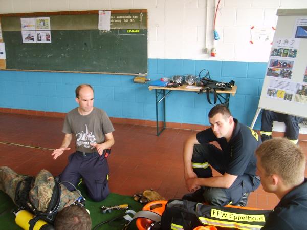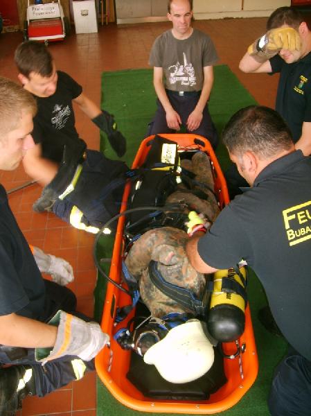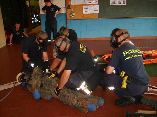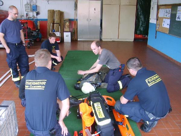 Die hierfür notwendige Sonderausrüstung wurde im Löschbezirk Bubach-Calmesweiler stationiert. Die Feuerwehrmänner und -frauen aus Bubach-Calmesweiler haben in den letzten Monaten intensiv trainiert, sich weitergebildet und sich so auf ihre zukünftige Sonderaufgabe vorbereitet. Am vergangenen Wochenende erfolgte schließlich trotz schwül warmen Klimas, eine weitere praktische Unterweisung aller Einsatzkräfte des Löschbezirks. Hier hatten alle nochmal die Möglichkeit in unterschiedlich dargestellten Ausgangssituationen das Vorgehen bei einem Atemschutznotfall lageabhängig zu üben und die verschiedenen Handgriffe zu verinnerlichen.